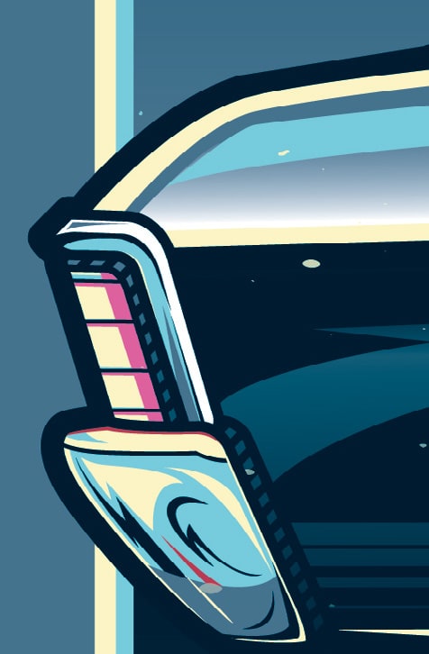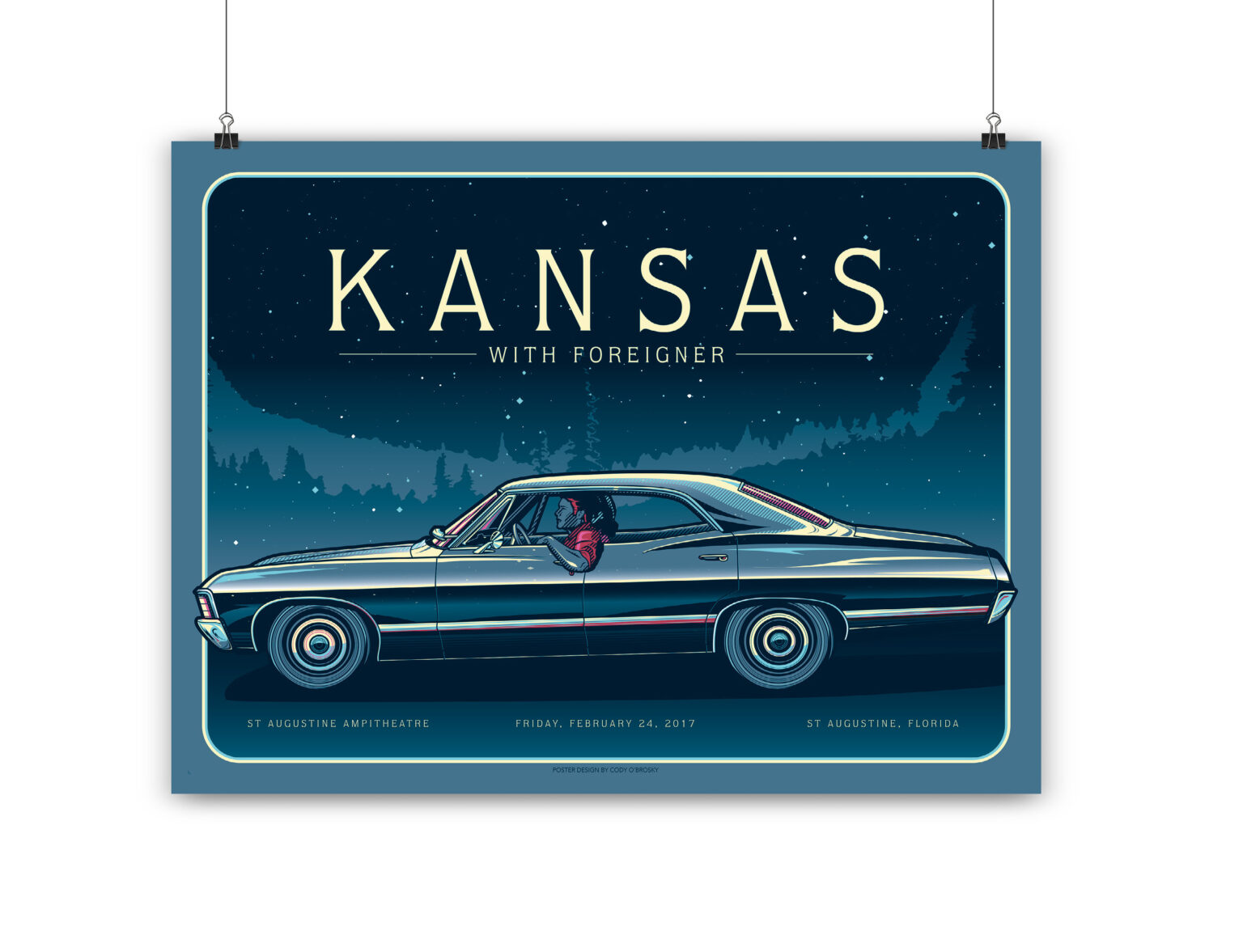 Kansas has been touring the country since 1973. They have produced eight gold albums and three multi-platinum albums. They are legends of American Rock, and creating a gig poster for one of their concerts was a heavy undertaking. One of their greatest hits is “Carry On Wayward Son.” The song is played in the season finale episode of The CW’s Supernatural. I used this as the jumping off point for the poster. To promote the band’s visit to the St. Augustine Ampitheatre, the poster depicts the boys as they travel across a Florida landscape in their ‘67 Impala.