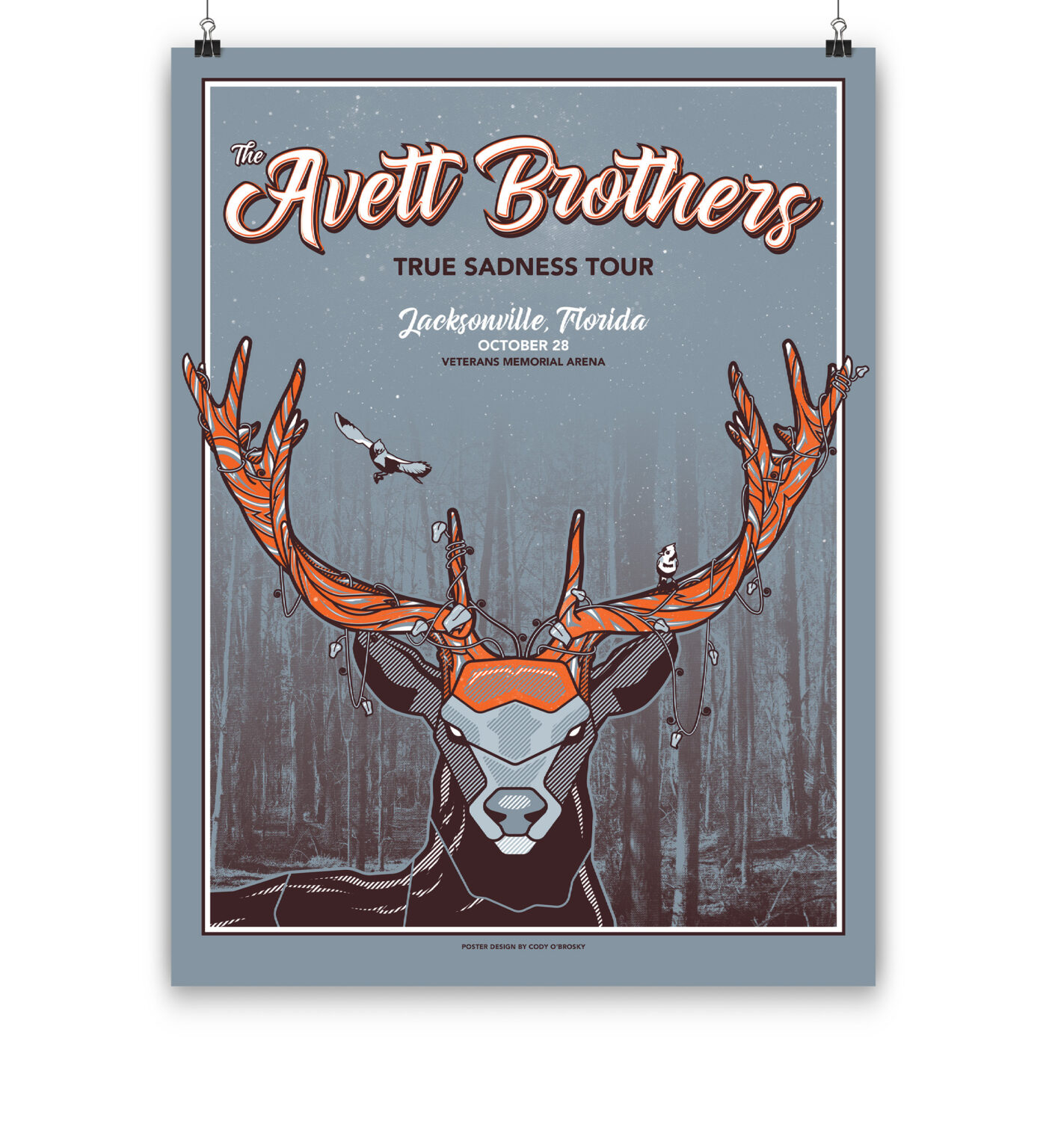 The Avett Brothers are a folk rock band from North Carolina. The True Sadness album was a slight departure from their usual sound and a statement. This poster was an attempt to capture the melancholic beauty of the record.