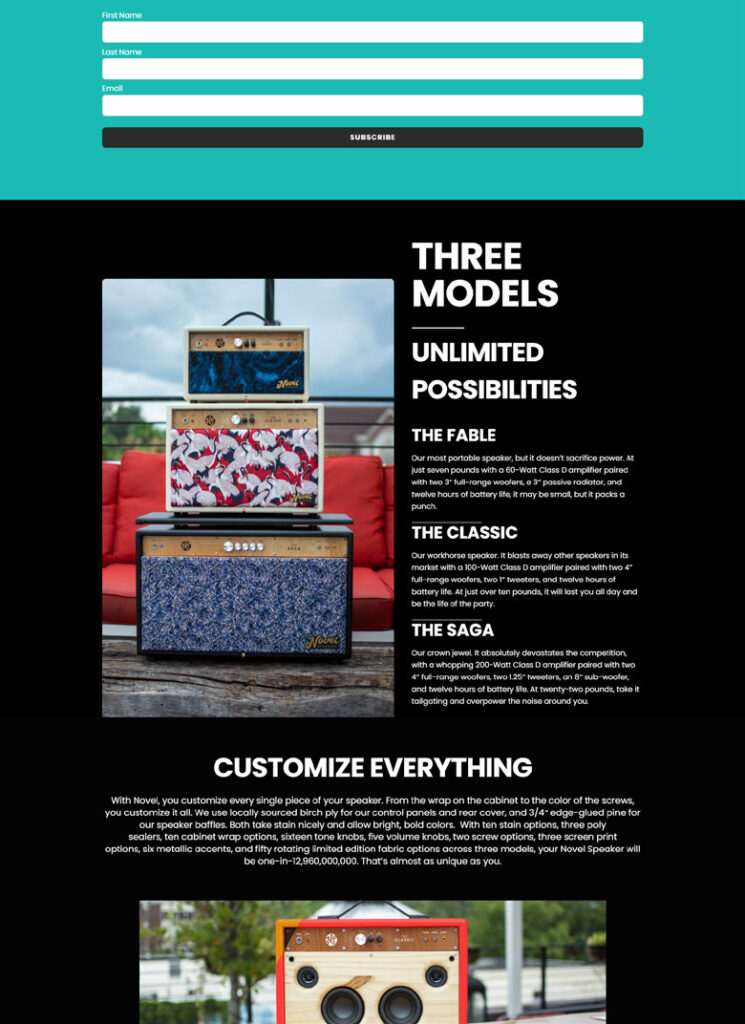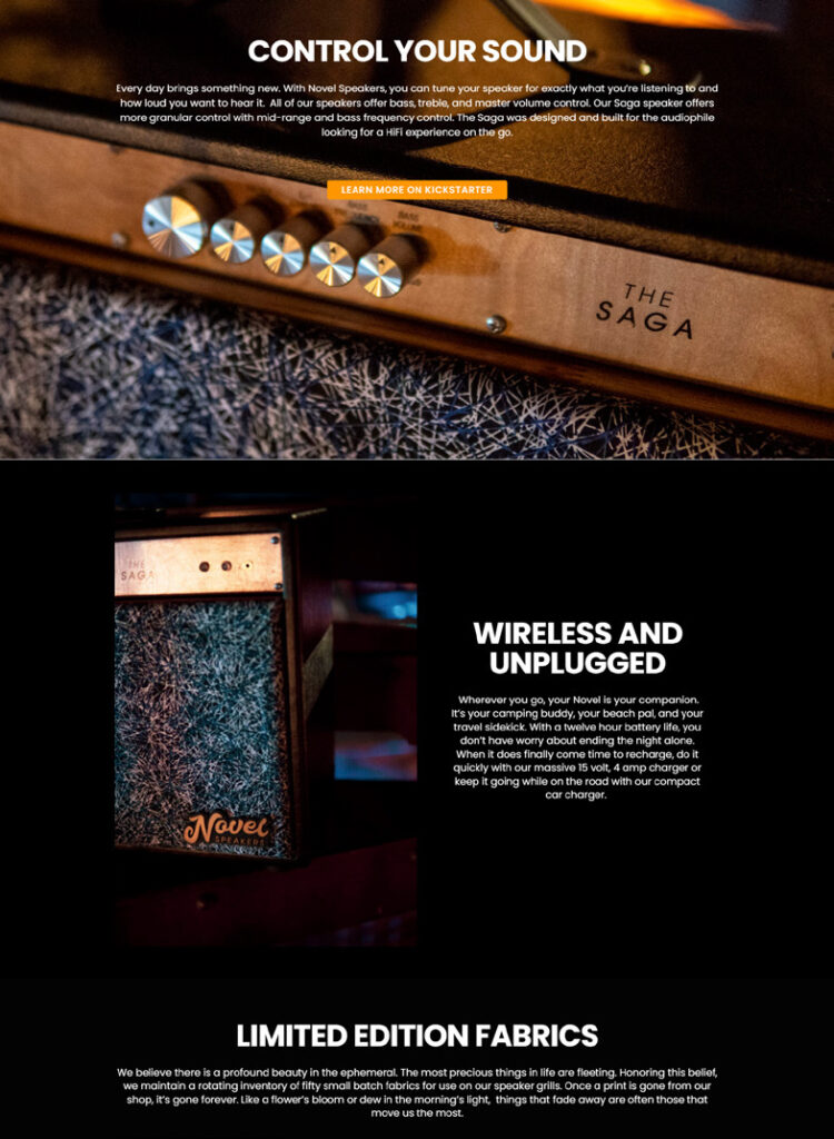The driving concept behind Novel Speakers is that your speaker should be as unique as you. The product aesthetic is classically inspired. For the branding, those two qualities had to be honored.