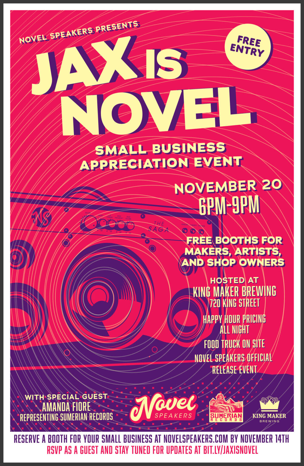 The Novel logo and mark utilize a hand drawn logotype combined with Herb Lubalin’s Avant Garde tying Novel Speakers securely to 70’s culture.The printed elements of the speakers also employ Avant Garde. Avenir is used a secondary typeface on smaller elements for enhanced readability.